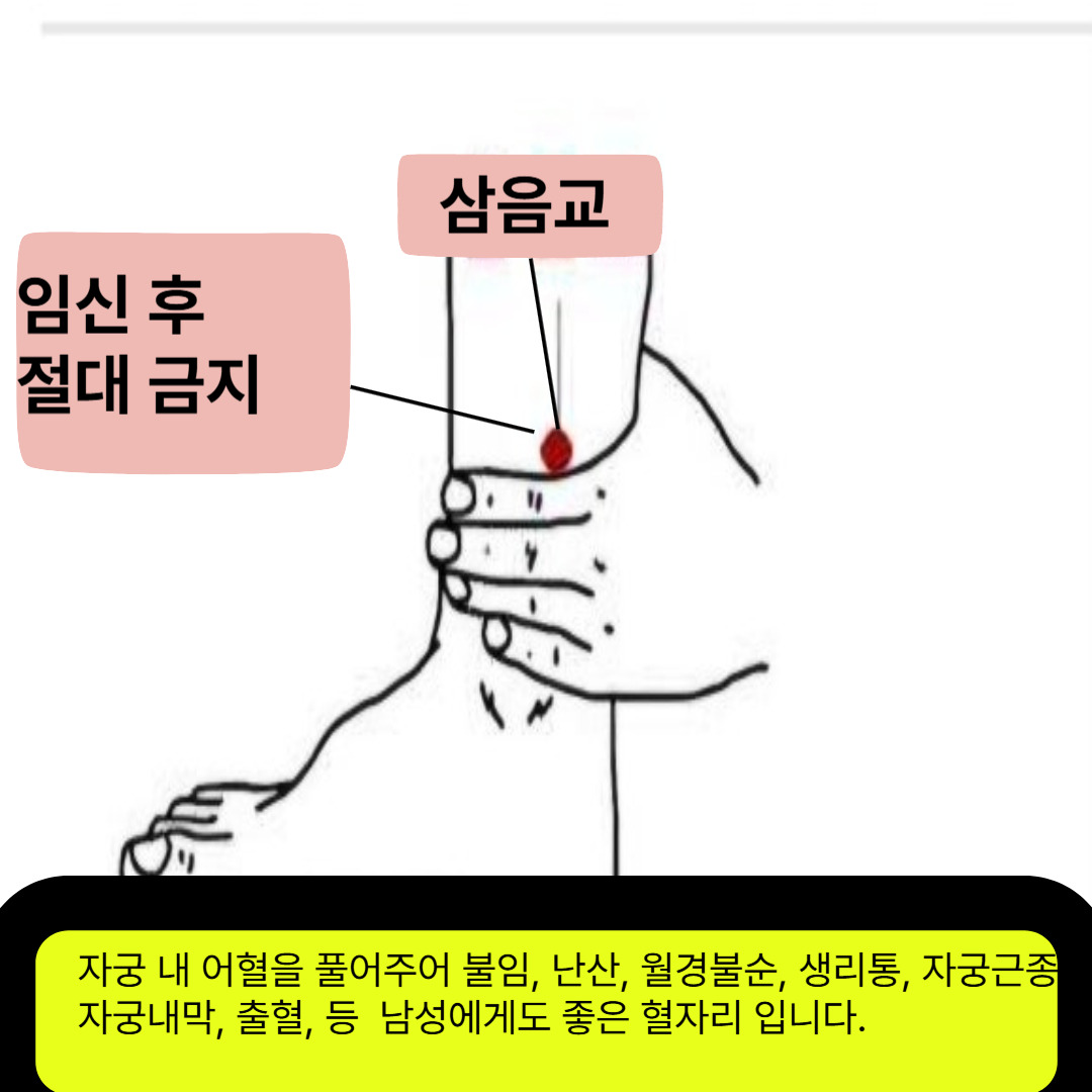 삼음교는 여성질환 치료에 있어 매우 핵심적인 혈자리입니다. 발목 안쪽 복숭아뼈에서 위로 손가락 세 마디, 약 7cm 지점에 위치합니다. 이 자리를 손으로 강하게 자주 자극하는 것만으로도 자궁과 난소 주변 혈류를 개선하는 데 도움을 줍니다.