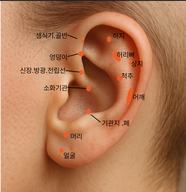 귀는 태아의 형상처럼 생겼으며, 머리부터 척추, 발까지 신체를 닮은 구조입니다. 실제로 귀의 특정 부위를 눌렀을 때 통증이 있다면 해당 장기에 이상이 있을 가능성도 있습니다. 귀 지압은 혈액순환 개선, 면역력 향상, 스트레스 해소에 효과적이며, 특히 소화기, 심장, 척추, 눈, 허리 등에 도움을 줄 수 있습니다.