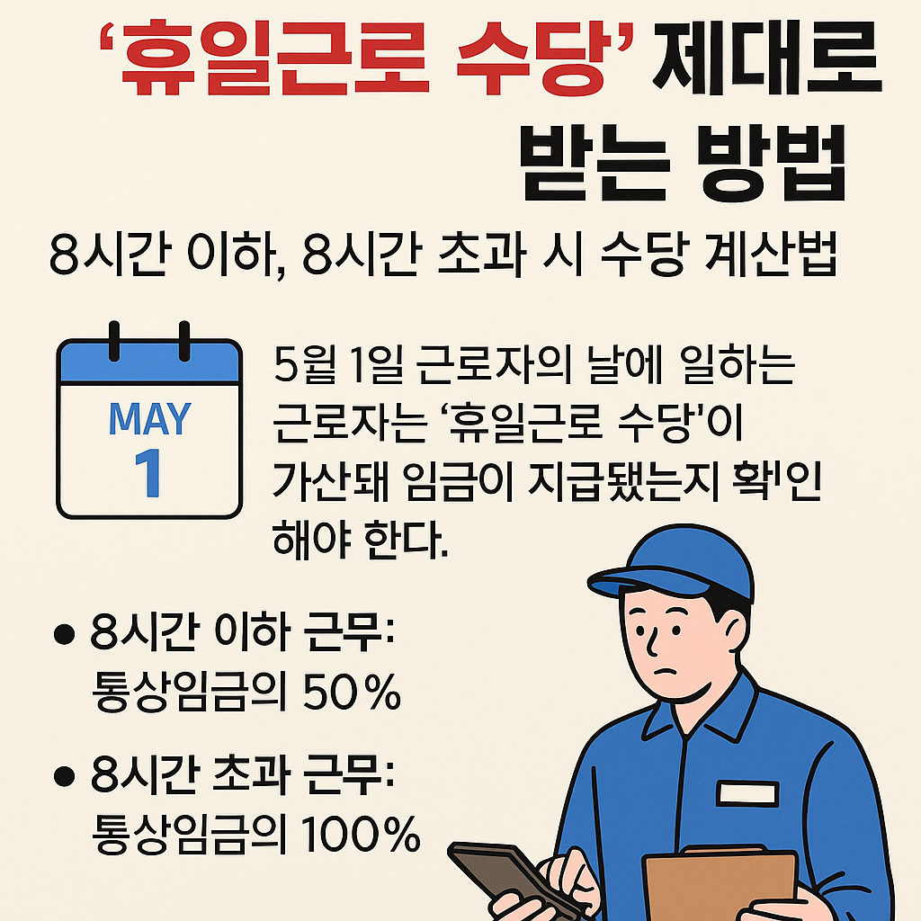 5월 1일 근로자의 날에 일하는 근로자는 '휴일근로 수당'이 추가로 지급되므로, 이를 확인하는 것이 중요합니다. 8시간 이내 근무 시 통상임금의 50%, 8시간을 초과하면 100%가 가산되어 지급되며, 이를 제대로 알고 대비하는 것이 중요합니다.