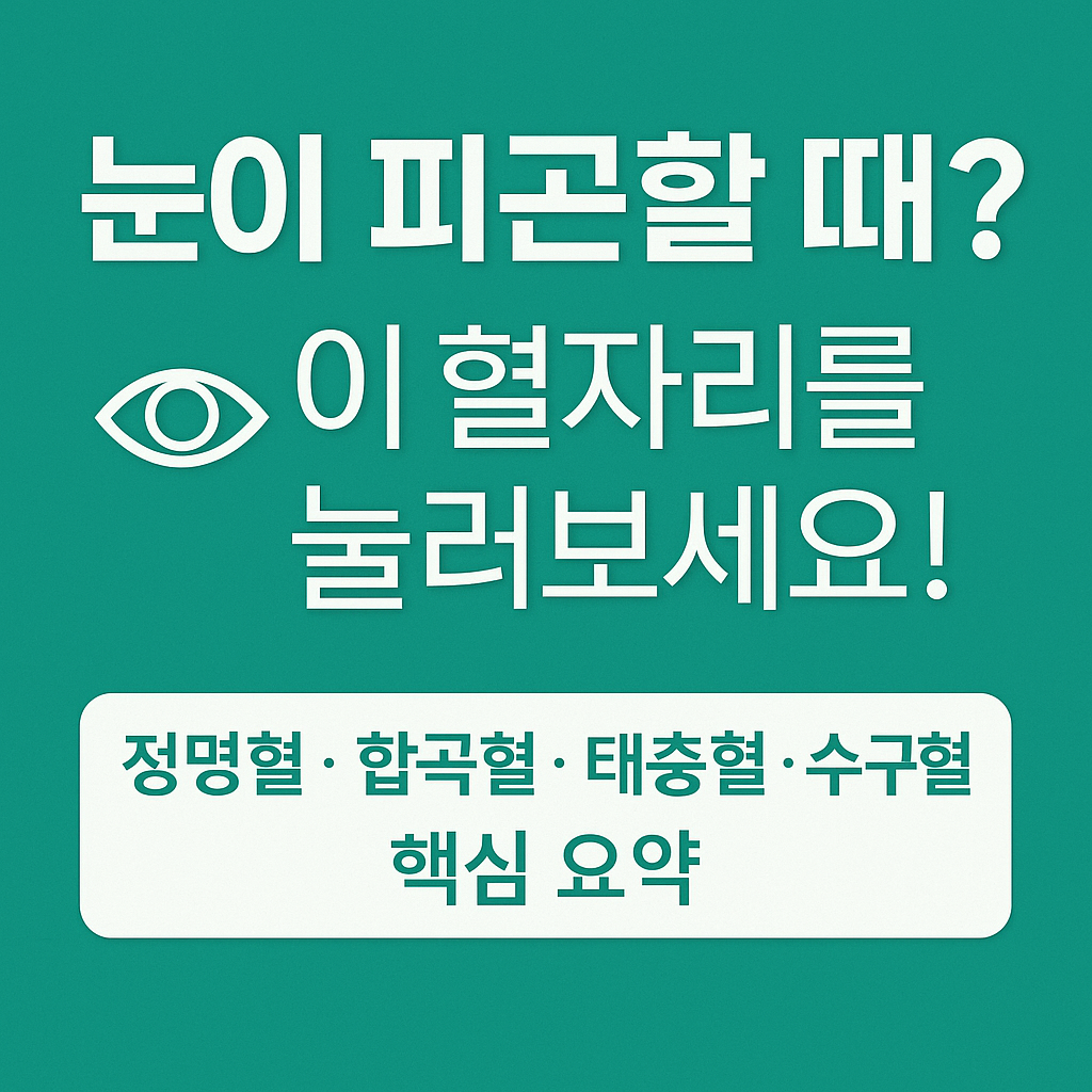 | 정명혈 | 눈 안쪽 코와 눈 사이 경계 지점 | 시력 보호, 눈 주변 순환 개선 |