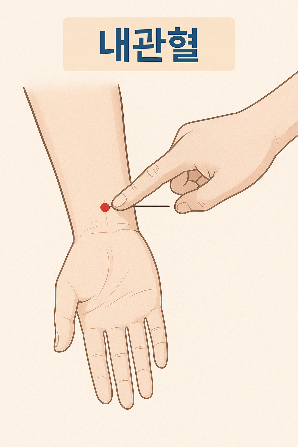 내관혈은 손목 안쪽, 손바닥 방향으로 손목선에서 약 2~3cm 위, 두 힘줄 사이 움푹 들어간 부위에 있습니다. 전통적으로 내관혈은 심장과 가슴의 에너지를 조절하는 혈자리로 알려져 있으며, 스트레스 해소뿐만 아니라 소화기 질환, 가슴 답답함, 멀미, 메스꺼움에도 자주 활용됩니다.