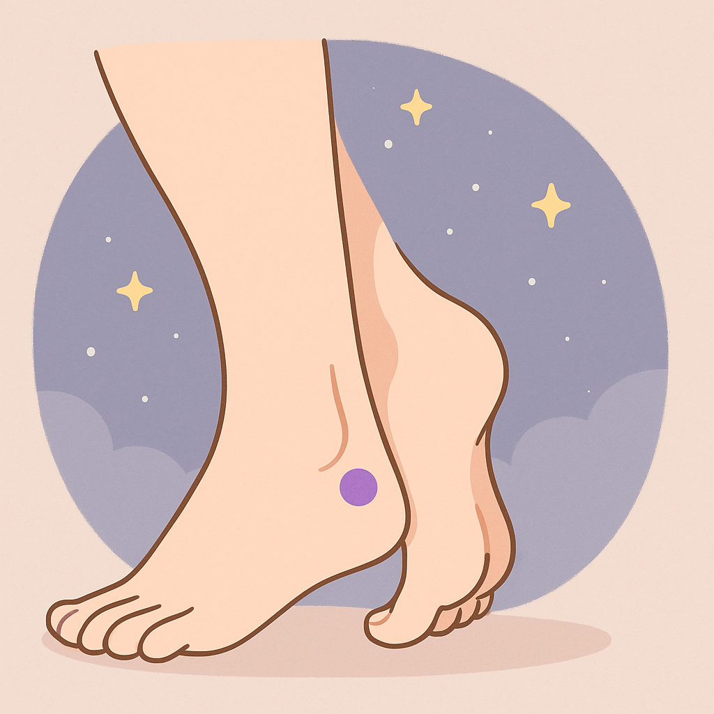 곤륜혈은 태계혈과 반대쪽, 바깥 복숭아뼈와 아킬레스건 사이에 위치합니다. 신장을 보호하고 요통을 개선하는 데 효과가 있으며, 성 기능 저하 예방에도 좋습니다.