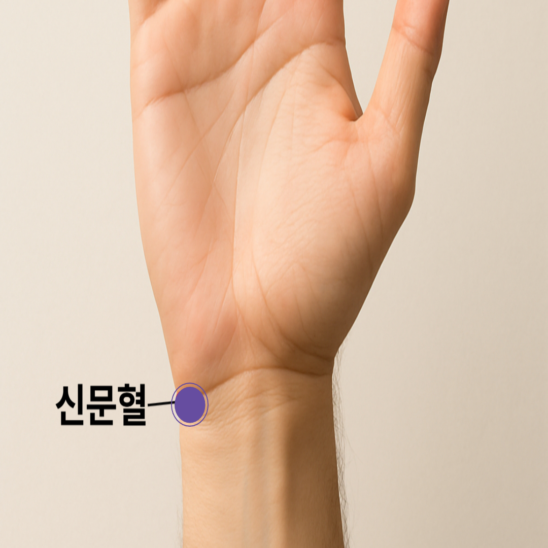 | 신문혈 | 손목 주름 위 새끼손가락 쪽 | 불안 완화·심장 안정 | 엄지로 30초 눌러줌 |