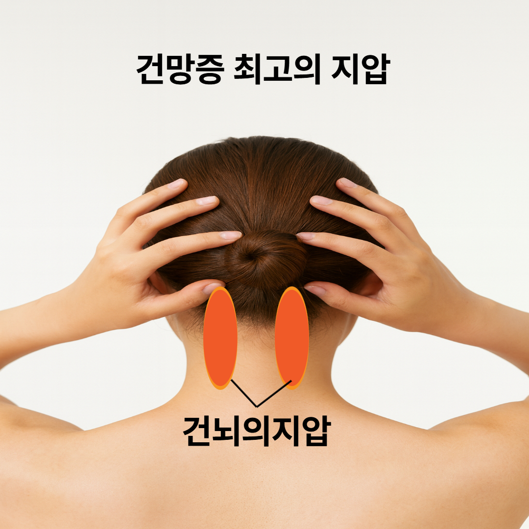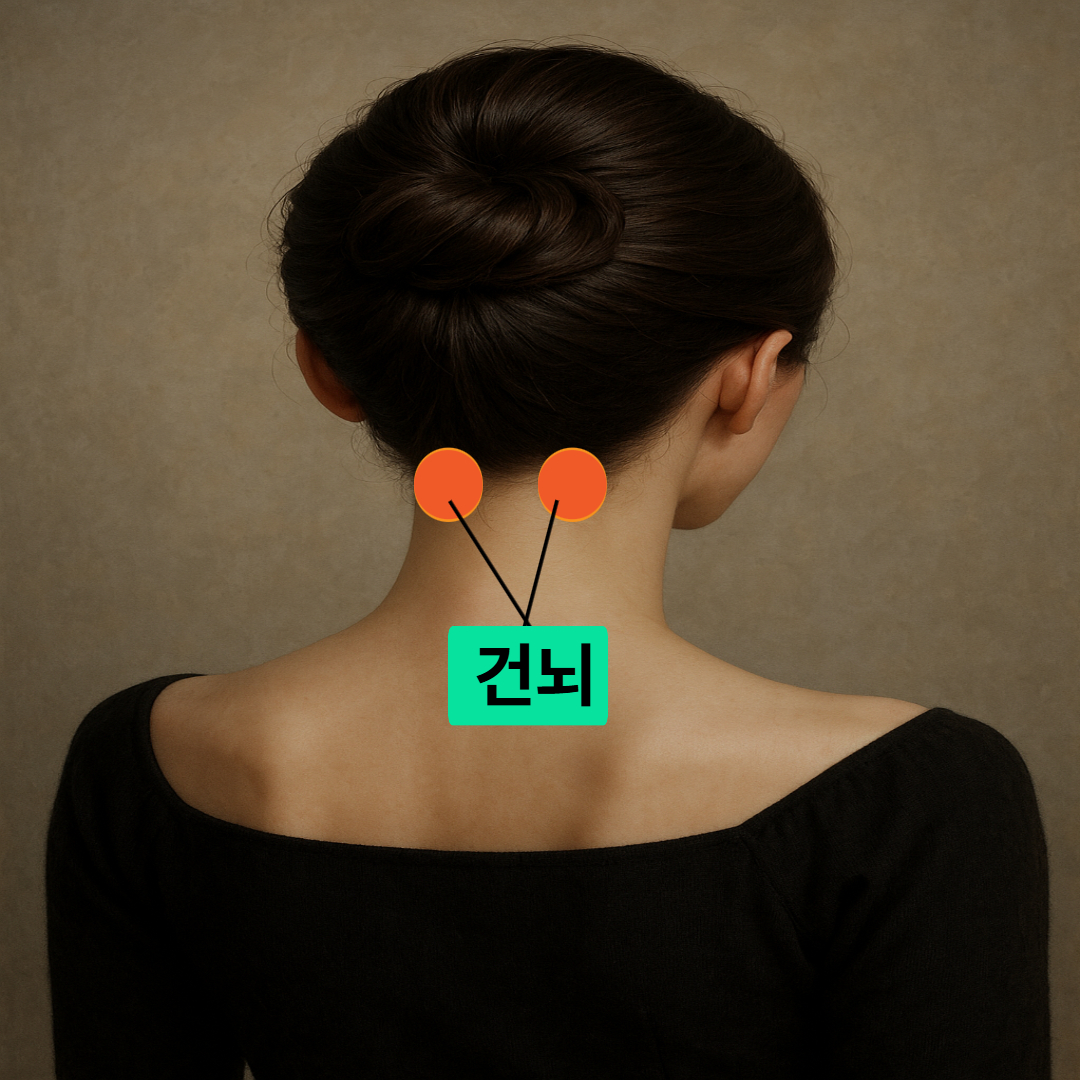 뒤통수 아래, 목과 머리 경계의 오목한 라인. 양손으로 머리를 감싸 엄지 지문을 대고 찾으면 편해요. | 자극 시 뇌 활성화·긴장 완화에 도움을 기대. |