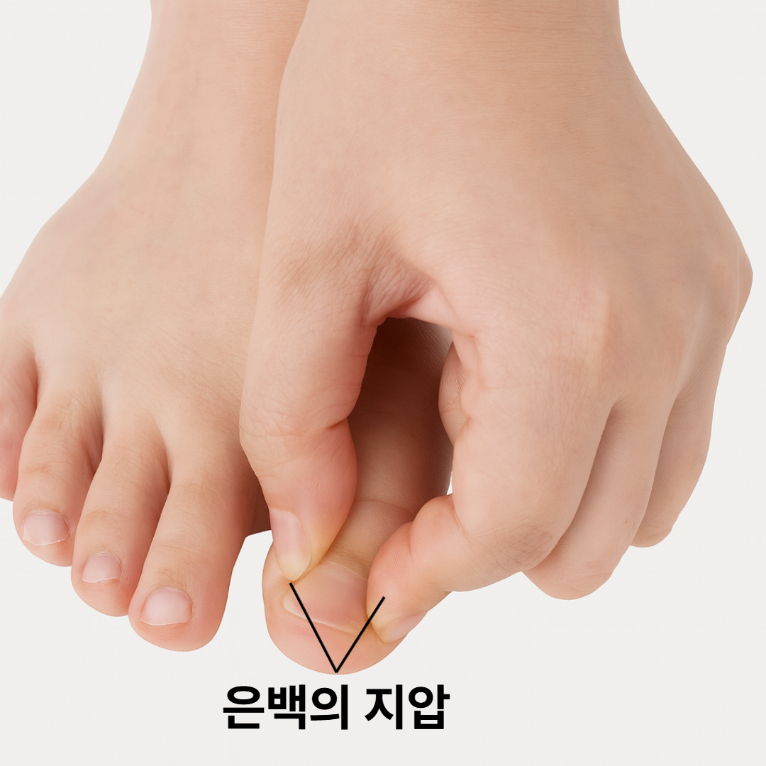 | 은백(隱白) | 엄지발가락 끝 경혈. 손끝으로 집어 가볍게 눌러 자극. |