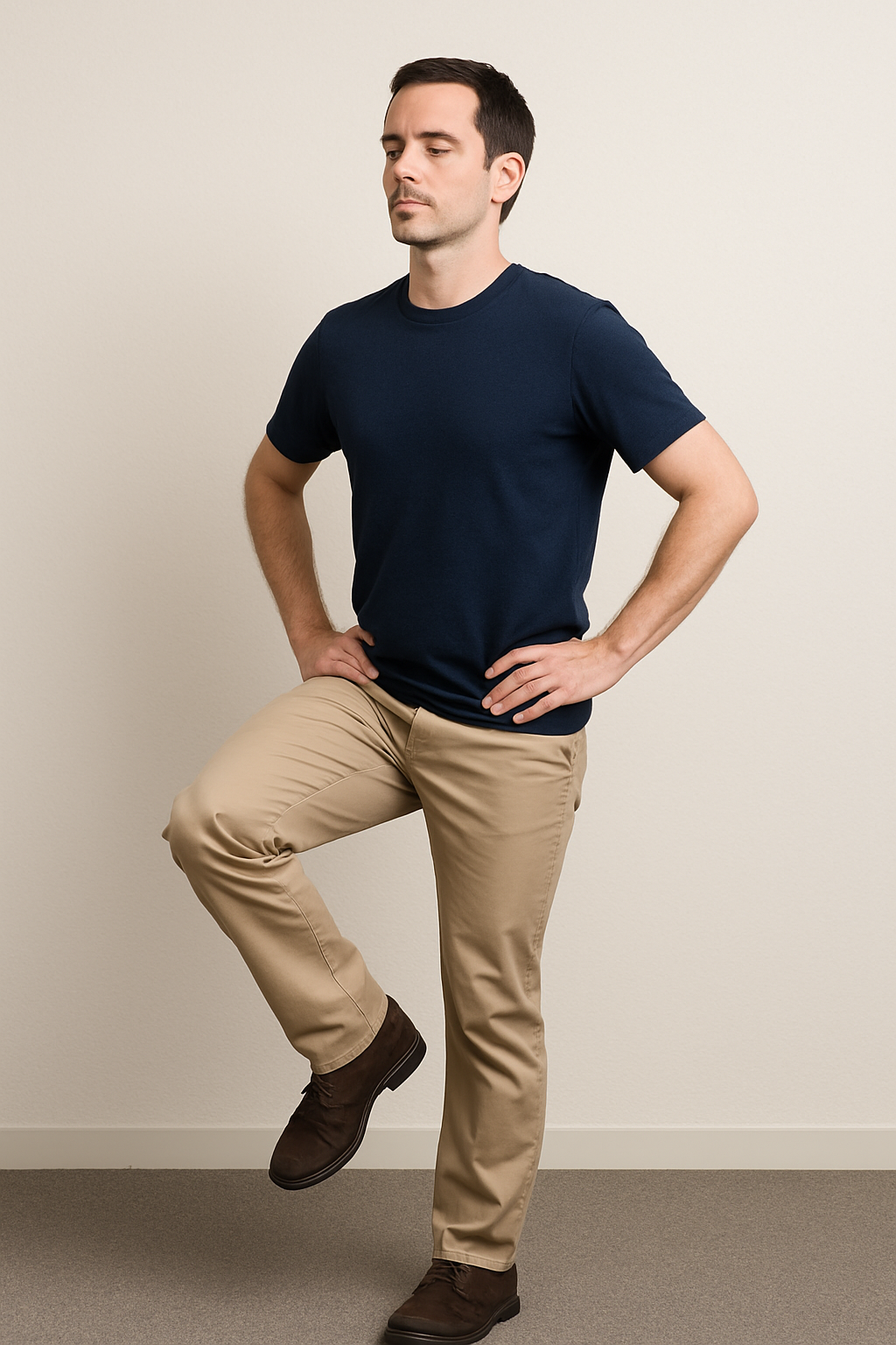 - 한쪽 발을 다른 발 앞에 두고 손을 엉덩이에 얹은 자세