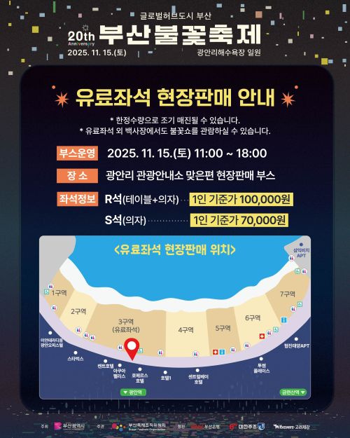 🎟 2025 부산불꽃축제 티켓·좌석 안내 보러가기※ 예매 페이지 링크는 매년 새로 열릴 수 있으니, 축제 시즌이 가까워지면 다시 한 번 접속해서 최신 정보를 확인하는 것이 좋습니다.