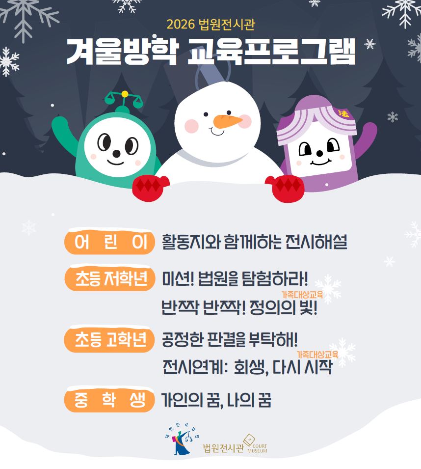 🏛️ 자녀 교육 필수! 초/중학생 겨울방학 '법원전시관 교육프로그램' 예약 및 체험 완벽 가이드 아이들의 올바른 시민의식과 법의 의미를 심어줄 수 있는 "법원전시관 교육프로그램" 예약 정보가 드디어 공개되었습니다! 초등학교 저학년부터 중학생까지, 학년별 맞춤 체험으로 법과 정의를 재미있게 배울 수 있는 절호의 기회입니다. 놓치지 말고 지금 바로 신청하세요! 🎀 목차 (Table of Contents) 1. 학년별 교육 프로그램 상세 안내 2. 예약 오픈 일정 및 신청 방법 (필독) 3. 법원전시관 공간 및 체험 정보 4. 실수하기 쉬운 주의사항 및 팁 5. FAQ (자주 묻는 질문) 6. 기본 정보 정리 및 공식 사이트 🧑🏻⚖️ 학년별 교육 프로그램 ..